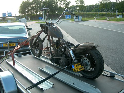 B) 22 november 2008. Afsleepdienst ANWB Zie deze sfeervolle afbeelding van de Harley eens achterop de vrachtwagen van de ANWB. Alleen al haast hierom zou u pech willen krijgen. Dit is, zegt Hildo, een eenmalig plaatje hoor want het gebeurt hem niet vaak dat de motor hem niet brengt tot waar hij zijn wil. De motor is inmiddels weer thuis en wacht nu geduldig tot Hildo zin krijgt om te sleutelen...
