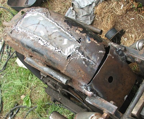 25 juli 2008 (5) Eindresultaat Prutteldeprut, knetterdeknet. Hildo weet wel wat u denkt, maar het zit. Voor extra stevigheid heeft Hildo twee plaatjes gesneden, van een 5 mm strip, en die er aan de boven- en onderkant als extra versteviging op gelast. De achterbrug is nu sterker dan ooit, straks even een laagje verf erover en het lasavontuur zit er weer op. Nu nog wat verse lagerschalen en lagers erin, de brug ligt er nu toch uit en een goede staat van onderhoud is belangrijk. Omdat Hildo zelf de lagerschalen niet kan verwijderen, hij heeft het gereedschap niet en knoeien daar houdt ie niet van, gaat ie even naar Eppie. Eppie wie? Eppie Nijboer van The Oldtimer!