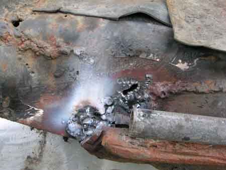 Routine lasklusje Zoals ieder voertuig heeft ook Hildo's Harley af en toe wat onderhoud nodig. No Problemo! Dat doet Hildo allemaal zelf! De scheuren in het achterspatbord namen zulke angstwekkende vormen aan dat Hildo binnenkort dacht het te zullen gaan verliezen. Dat moet natuurlijk niet en dus wordt het lasapparaat ter hand genomen. Kan er ook weer eens iemand achterop. Routineklusje.