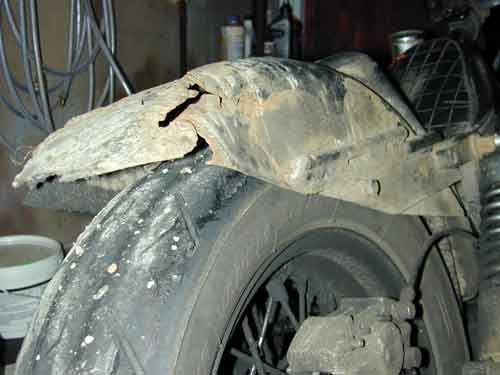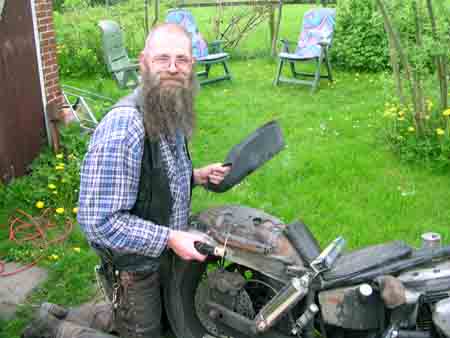 Met de conservering van Hildo's spatbord is het wat minder gesteld. Nee, Hildo meent dat er verder niets mis mee is. Komt gewoon van het trillen. Af en toe weer wat aan elkaar vast bakken en dan gaat het wel weer. Waar heb je anders een lasapparaat voor?