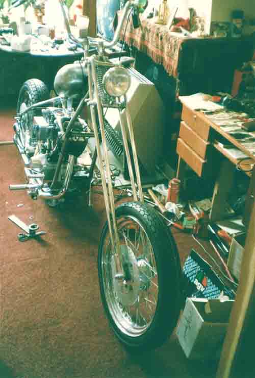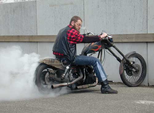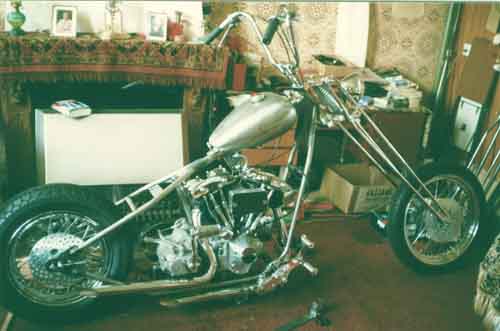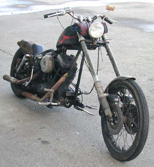 Hildo's Eigenbouw 'Harley' Wij schrijven het jaar 1986. De bouw en het verzamelen van de extra centen, namen 2 jaar in beslag. Om het geld zo snel mogelijk bij elkaar te krijgen, heeft Hildo veel, heel veel gewerkt, overuren, etc. gedraaid. Niets belangrijker dan de Harley! Hildo begon met de bouw van de chopper, in de voorkamer van het ouderlijk huis, in 1985 en sinds de zomer van 1987, na goedkeuring door het RDW (Rijks Dienst Wegverkeer) rijdt Hildo met de motor, bijna geheel legaal, in het rond. En de naam Harley... ach, het is helemaal geen Harley want als je de kentekenpapieren er op na slaat zie je 'Eigenbouw' staan. De techniek De eerste paar jaren was de motor voorzien van een origineel 1200 Shovel blok uit 1974 met een Andrews BH nokkenas, vaste stoters en Wiseco zuigers. De late Shovel is naar Hildo's mening het mooiste blok wat Harley ooit heeft geproduceerd. Maar het had meer problemen dan een hond vlooien, dus werd omgezien naar een andere voortstuwing. In 1990 waren de Evo motoren in de aanbieding en Hildo kon een goede inruil krijgen voor de Shovel. Weg ermee! Een Evo blok is wel wat saai, een standaard Evo al helemaal, dus besloot Hildo om direct een paar dikke cilinders van Sputhe Engineering te monteren. Alles geïnspireerd door een verloren stoplicht race tegen een BMW R100RS met het Shovel blok, dat zou Hildo niet weer gebeuren! Het geheel nieuwe blok werd voordat het een meter gelopen had uit elkaar geschroefd en het carter opgeboord om ruimte te maken voor de Sputhe big bore cilinders. Vandaag de dag wordt u met 124" (2 liter) en zelfs 145" S&S blokken om de oren geslagen maar met 95 inch (1564cc) had Hildo in 1990 een monster van een motor. BMW's for breakfast en zwarte strepen op het asfalt! Zelfs een Suzuki GSX1100 moest het een keer tegen de Harley afleggen! De combinatie lange motorfiets, veel van het gewicht op het achterwiel, zachte compound achterband en veel koppel blijkt het gebrek aan paardenkrachten aardig te maskeren en maakt van de motor een geduchte tegenstander, zolang het volgende stoplicht niet te ver weg is.