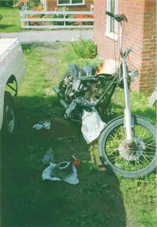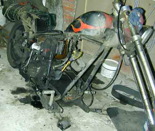 Zonder motor ziet de Harley er maar zielig uit. Het slechte uiterlijk van de motor is voor het grootste gedeelte uiterlijke schijn, meent Hildo, want onder alle vuil en vet wordt het metaal goed beschermd tegen weersinvloeden en ziet hij er bijna als nieuw uit. Hildo neemt dan ook regelmatig het oliespuitje ter hand om her en der wat olie over de motor te spuiten. Een goede conservering is alles!