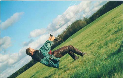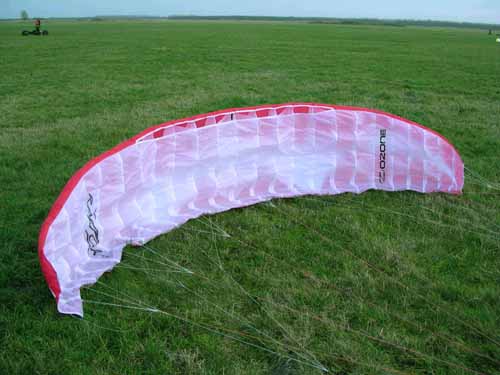 De Ozone 5.5 Razor De Razor is nog een racevlieger waar Hildo zijn hart aan verpand heeft. Ze worden gemaakt door de Engelse firma Ozone, een parapente specialist. Parapente vliegen, of schermvliegen in het Nederlands, is een sport waarbij men hangend aan een soort supervlieger door het luchtruim vliegt. Een firma met deze achtergrond weet drommels goed hoe van van draad en doek een goede vlieger te bouwen. Ozone vliegers staan dan ook bekend om hun perfecte afwerking en hoge kwaliteit. Het is een genot naar eentje te kijken... Maarre, vliegt het ook nog een beetje? Jazeker wel, als er één vlieger is die de Bora van Libre kan bijhouden, dan is het de Razor wel. Hildo heeft er twee, een geel/rode 5.5 en een rood/witte 3.5. De Razor is niet alleen snel, maar is ook voorzien van geweldige graphics, de mooiste van allemaal wat Hildo betreft. In verhouding tot de Bora is de Razor zelfs nog wat breder, maar ook wat vierkanter aan de vleugeltippen en mogelijk met wat agressievere vliegeigenschappen. De vleugeltippen van de Razor zijn lastig, want ze hebben telkens de neiging naar binnen te vouwen wanneer de vlieger niet goed onder druk gehouden wordt. De Razor houdt van vliegen, niet van stilstaan in de lucht. Zolang je dat in de gaten houdt, is de Razor een prima te hanteren vlieger, maar misschien toch nog iets lastiger dan de Bora. Het is en blijft een full race vlieger en dat merk je ook aan de explosieve kracht waar je soms bang van wordt. Zelfs het laten landen midden in het windvenster heeft Hildo goed onder controle met beide Razors. Ze luisteren prima naar de remlijnen en zijn daarmee uitstekend te controleren. Met prijzen iets beneden die van de Bora is het een dure vlieger, maar je krijgt er wel wat voor terug. Hildo's mening: geweldige echte mannenvlieger, misschien nog wel mooier dan de Bora, misschien ook wel niet... of wel... of niet... Agressieve eigenzinnige supervlieger in elk geval!