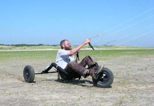 Big Foots op de Libre Zelfs met hele dikke wielen en heel veel vliegers is er geen klap aan als er geen wind staat. Dat is dan ook het grote nadeel van vliegeren. Je bent erg afhankelijk van het weer. Niet te veel, niet te weinig en lekker constante wind, lekker warm en lekker droog. De combinatie van dit soort omstandigheden zijn in Nederland helaas zeldzaam. Misschien dat Hildo ooit nog eens naar een tropisch eiland verhuist waar altijd een gelijkmatig tropisch windje over het strand waait. Wel oppassen voor kokosnoten want als je die onder je wiel krijgt ga je zo over de kop.