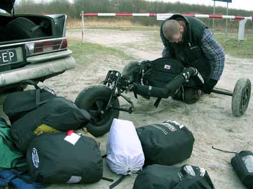 Gevaar op de weg! En soms is het zo dat je geen auto tot je beschikking hebt, maar wel wil buggyen. Vlot doorrijden en hopen dat je geen politie tegenkomt. Vooralsnog geen andere gekken gezien die hun buggy op deze manier vervoeren, dus Hildo lijkt een primeur gehad te hebben.