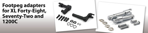 Footpeg adapters for XL Forty-Eight, Seventy-Two and 1200C If you own a 11-15 Sportster Custom, Forty Eight or Seventy Two you may have noticed that these bikes come with a rider footpeg that has a new style mount. Therefore the regular the male mount H-D style pegs, in which there is an enormous choice, will not fit. Luckily the Good News guys & galls from Motorcycle Storehouse have just announced they have a special footpeg adapter for the 11-15 XL1200C/X/V models. After installation of this bracket kit, available as 505501 (chrome) or 505502 (black), you will be able to install any and all regular H-D male mount footpegs. If you think the stock position of the footpegs is too close, go for the 2" extend brackets, available as 505503 (chrome) or 505504 (black). Check www.motorcyclestorehouse.nl or contact your dealer for any details you may need.